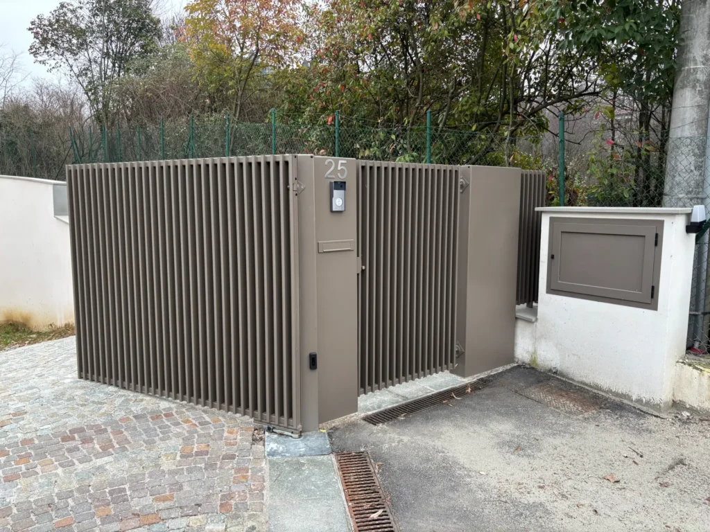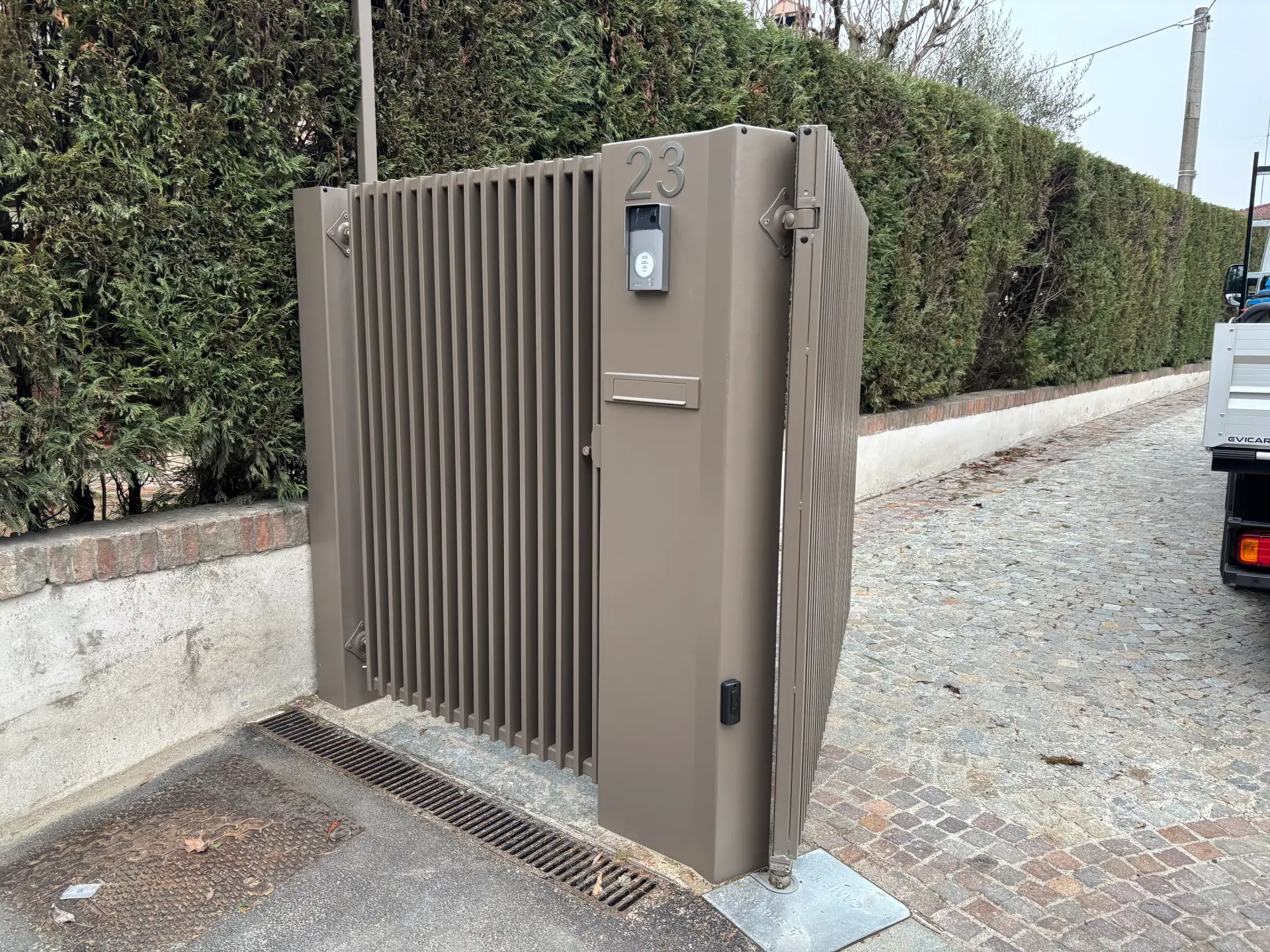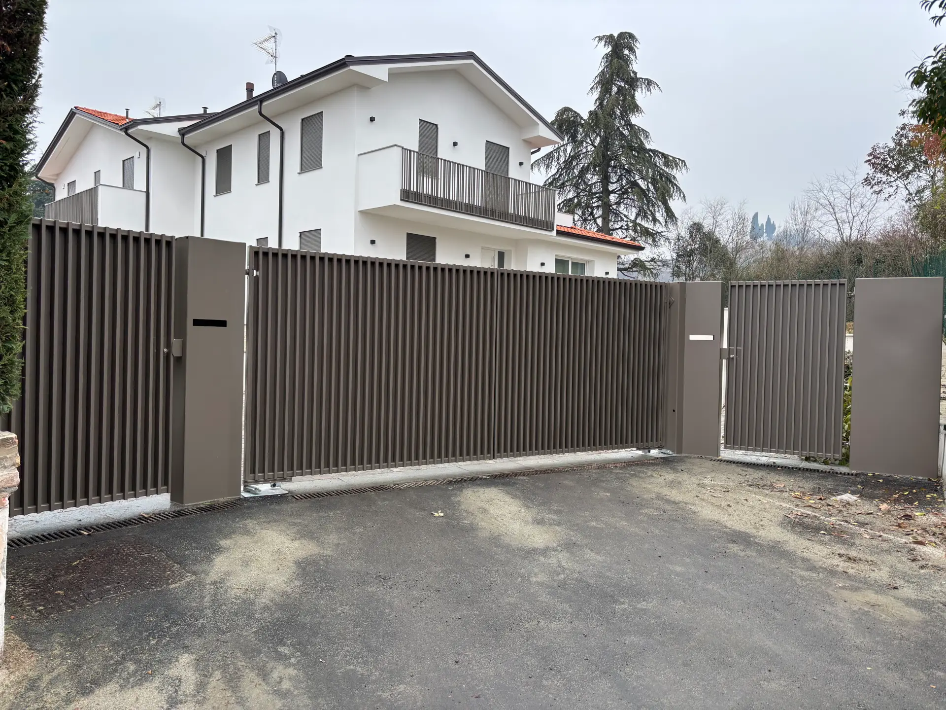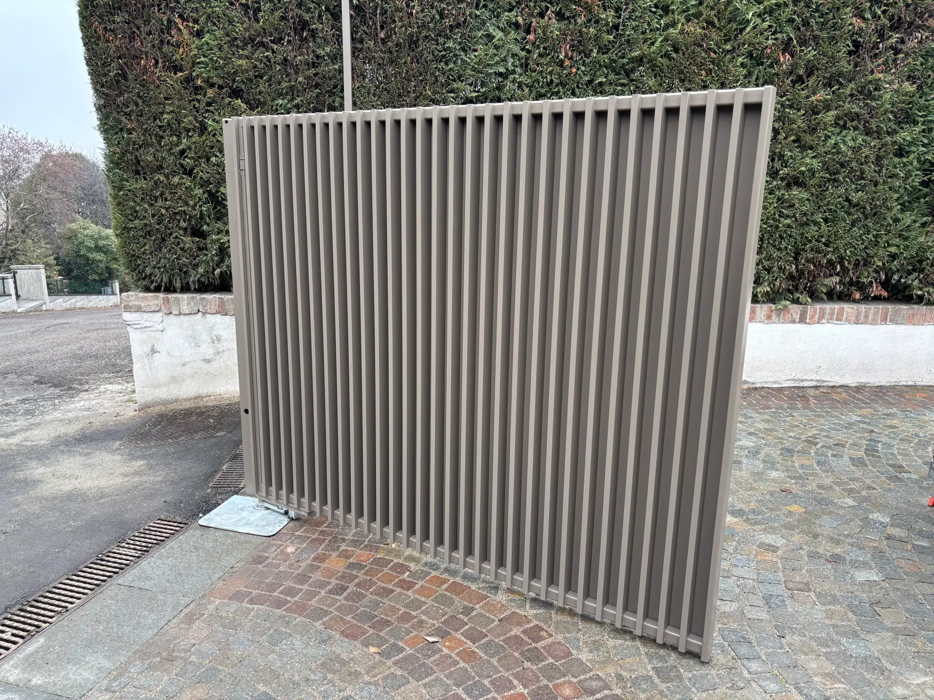 Intervento realizzato per un cliente privato, con installazione di cancello carrabile scorrevole in metallo verniciato, caratterizzato da un design a doghe verticali fitte che garantisce elevata privacy e un’estetica moderna e rigorosa. L’opera è inserita in un contesto residenziale esterno, integrandosi armoniosamente con la pavimentazione in pietra e la recinzione esistente.