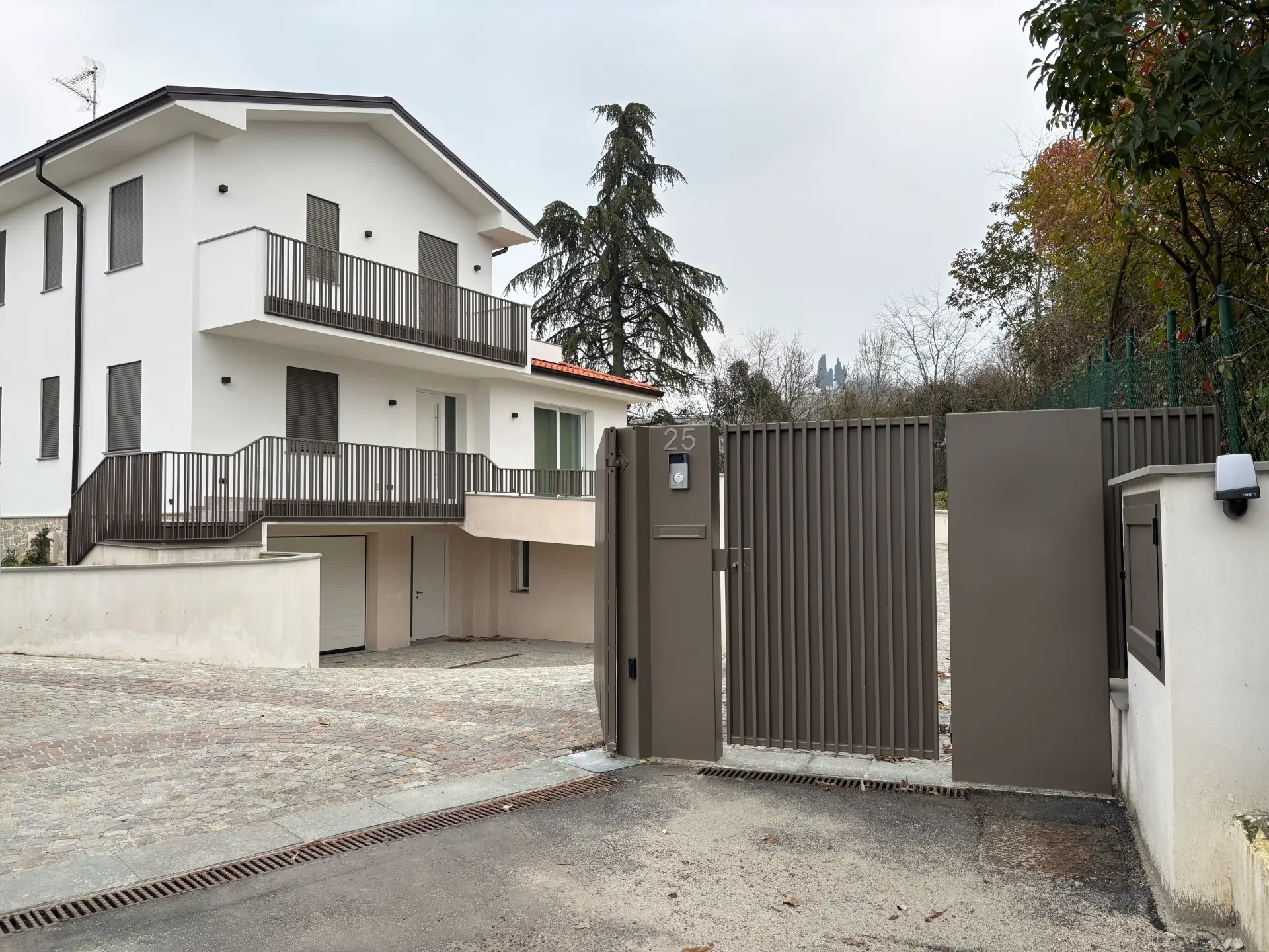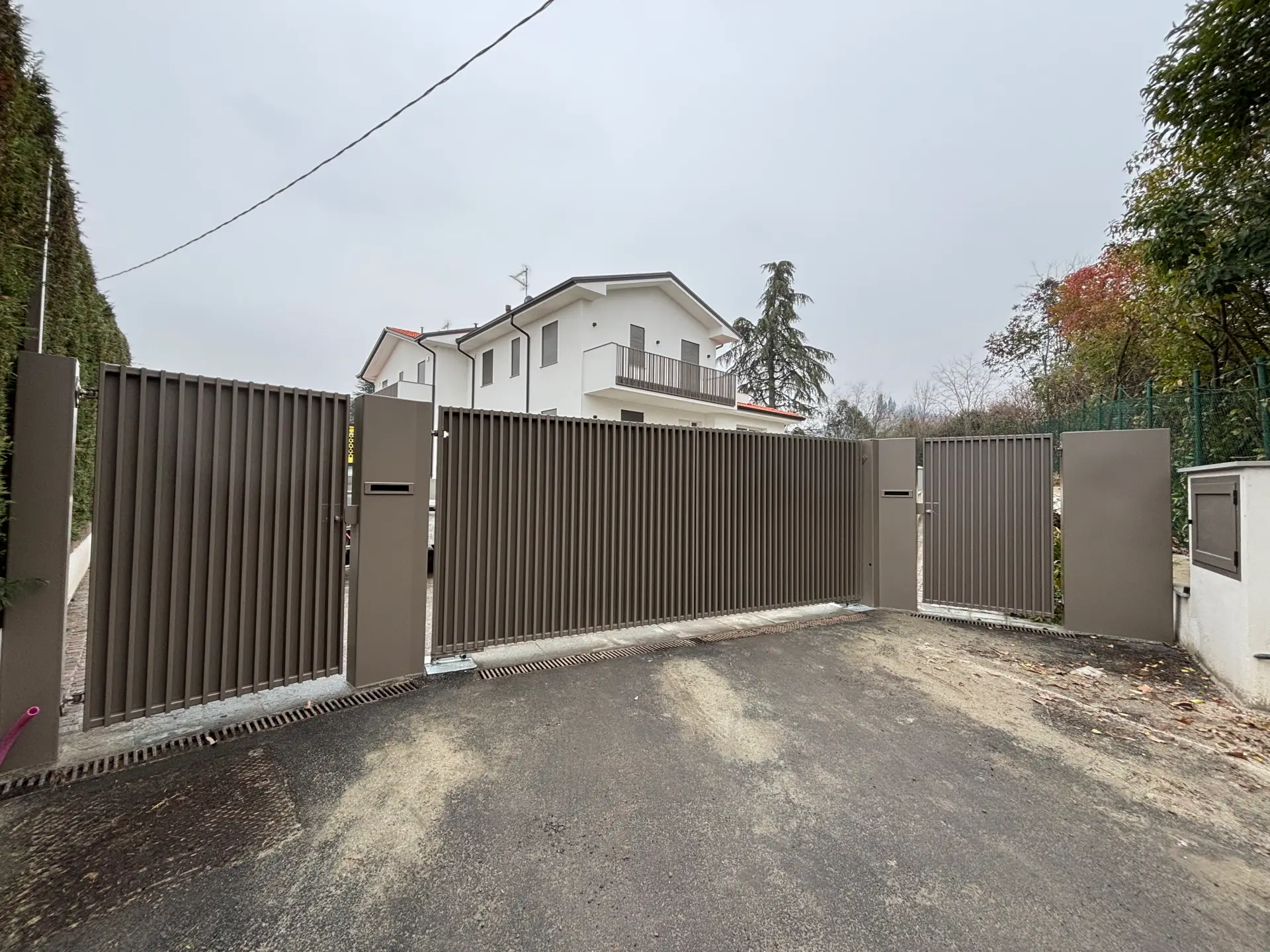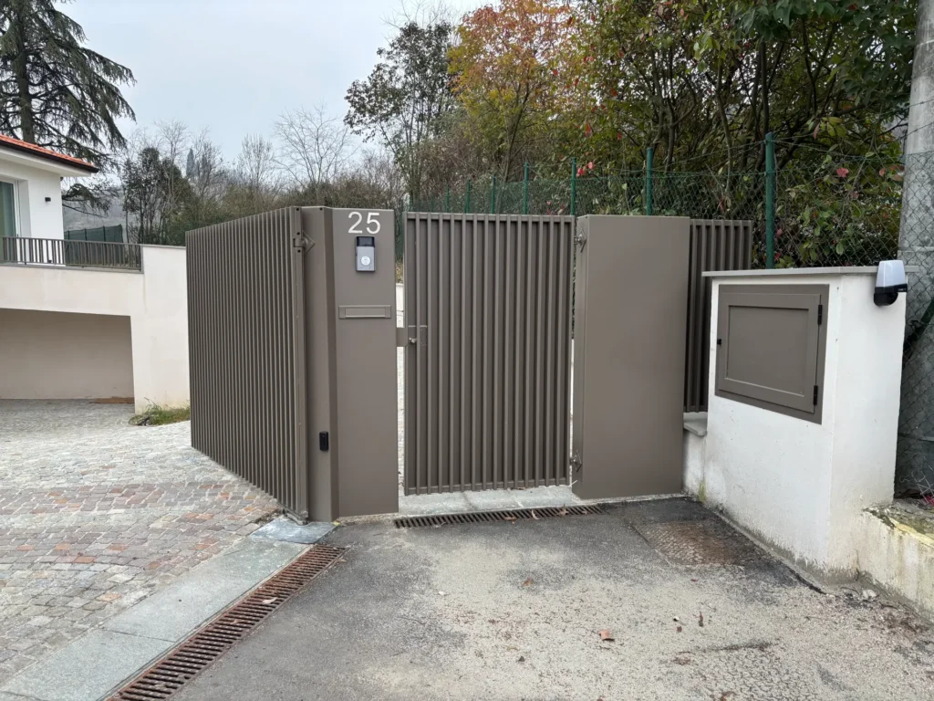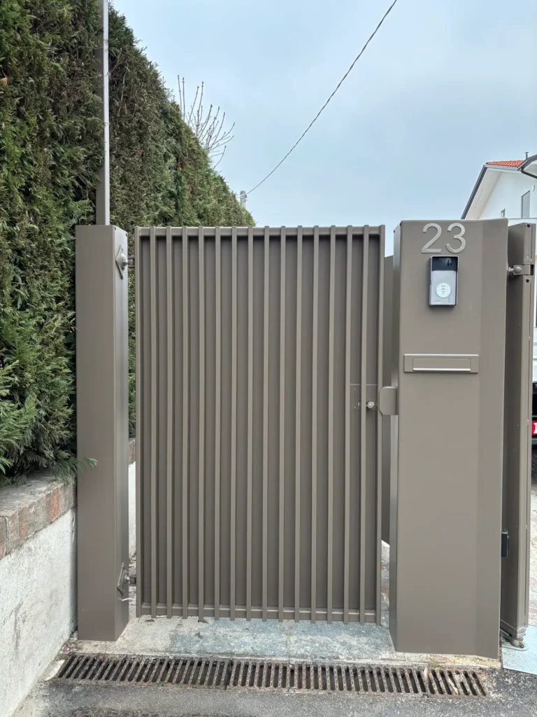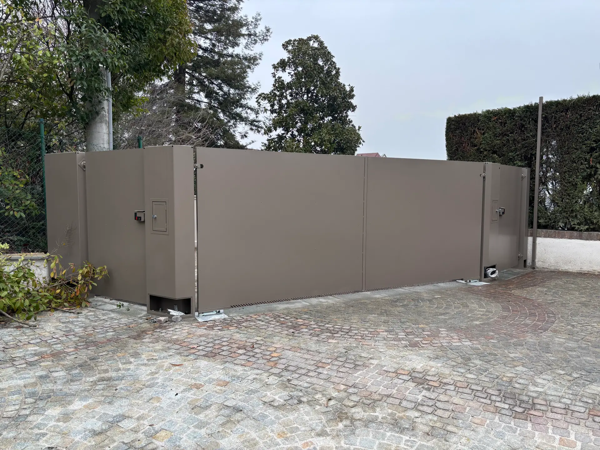 Intervento realizzato per un cliente privato, con installazione di cancello carrabile scorrevole in metallo verniciato, caratterizzato da un design a doghe verticali fitte che garantisce elevata privacy e un’estetica moderna e rigorosa. L’opera è inserita in un contesto residenziale esterno, integrandosi armoniosamente con la pavimentazione in pietra e la recinzione esistente.