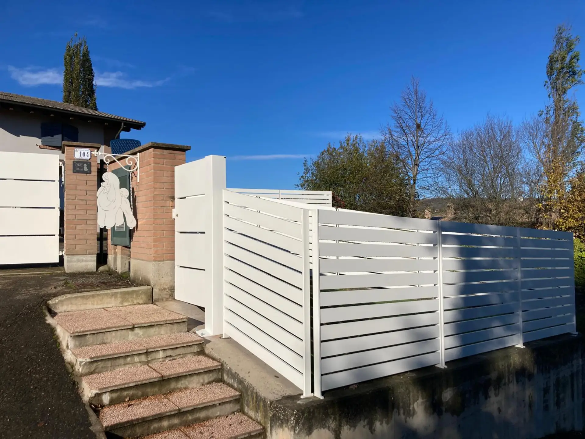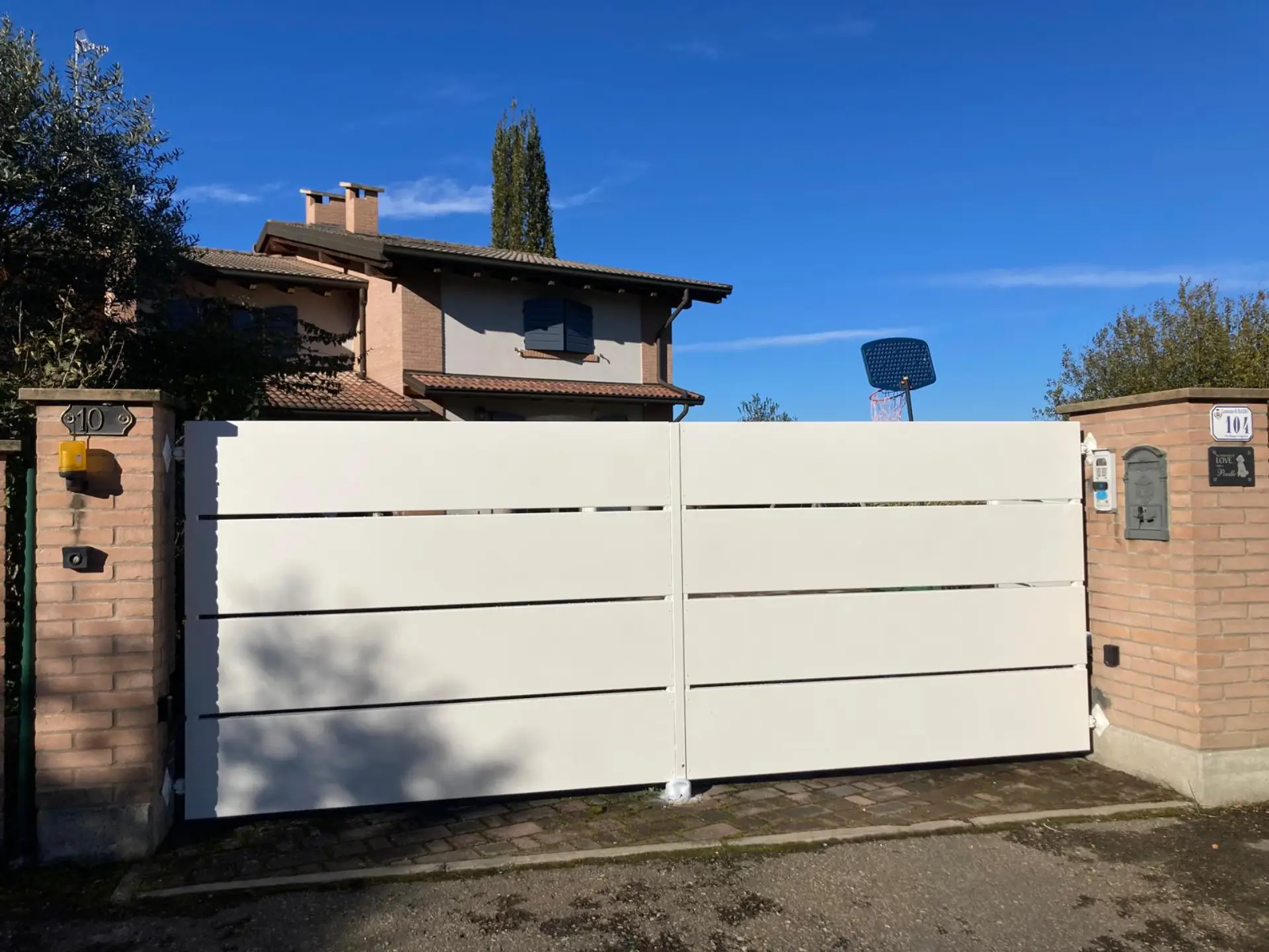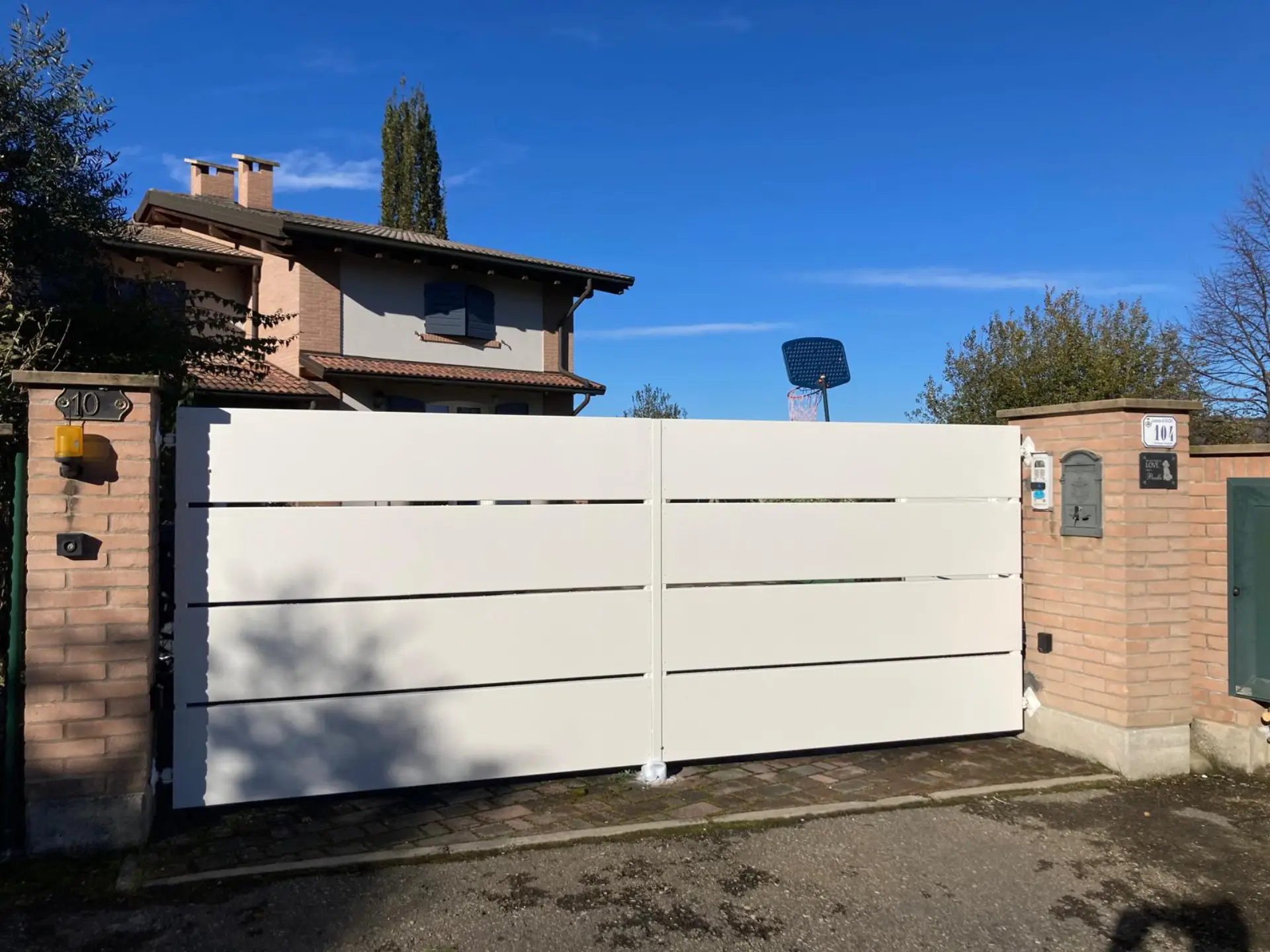 Intervento realizzato per un cliente privato a Scandiano, con installazione di cancello e recinzione in metallo verniciato bianco, caratterizzati da doghe orizzontali dal design moderno che garantiscono un buon equilibrio tra privacy e leggerezza visiva. L’opera è inserita in un contesto residenziale esterno, valorizzando l’ingresso dell’abitazione e integrandosi armoniosamente con gli elementi esistenti in muratura e mattoni faccia a vista.