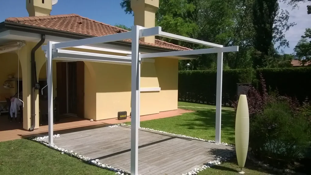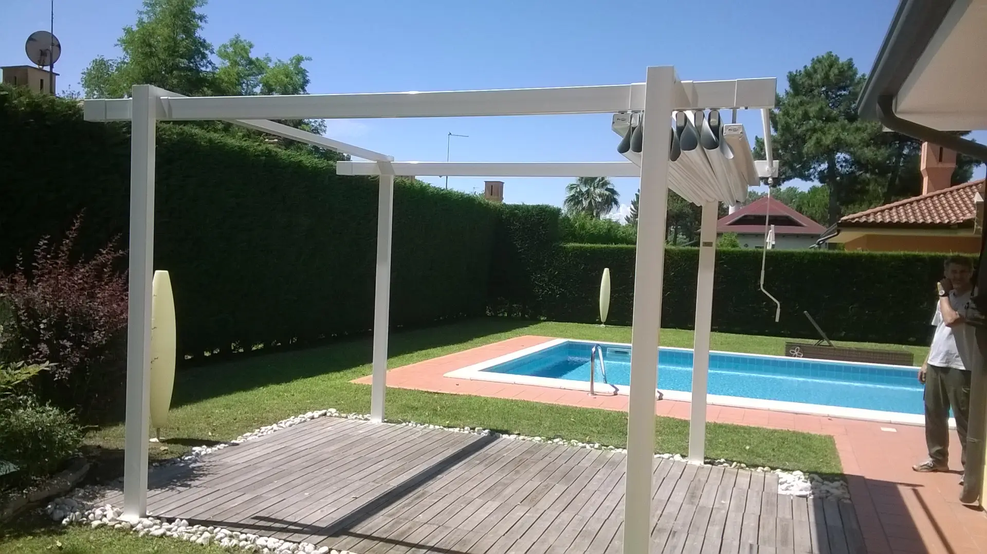 Intervento realizzato per un cliente privato, con installazione di pergola in metallo verniciato con copertura retraibile, caratterizzata da una struttura leggera e lineare che consente di modulare ombreggiatura e protezione in base alle esigenze. L’opera è inserita in un contesto residenziale esterno, valorizzando l’area living del giardino e creando uno spazio funzionale ed elegante in continuità con l’abitazione.