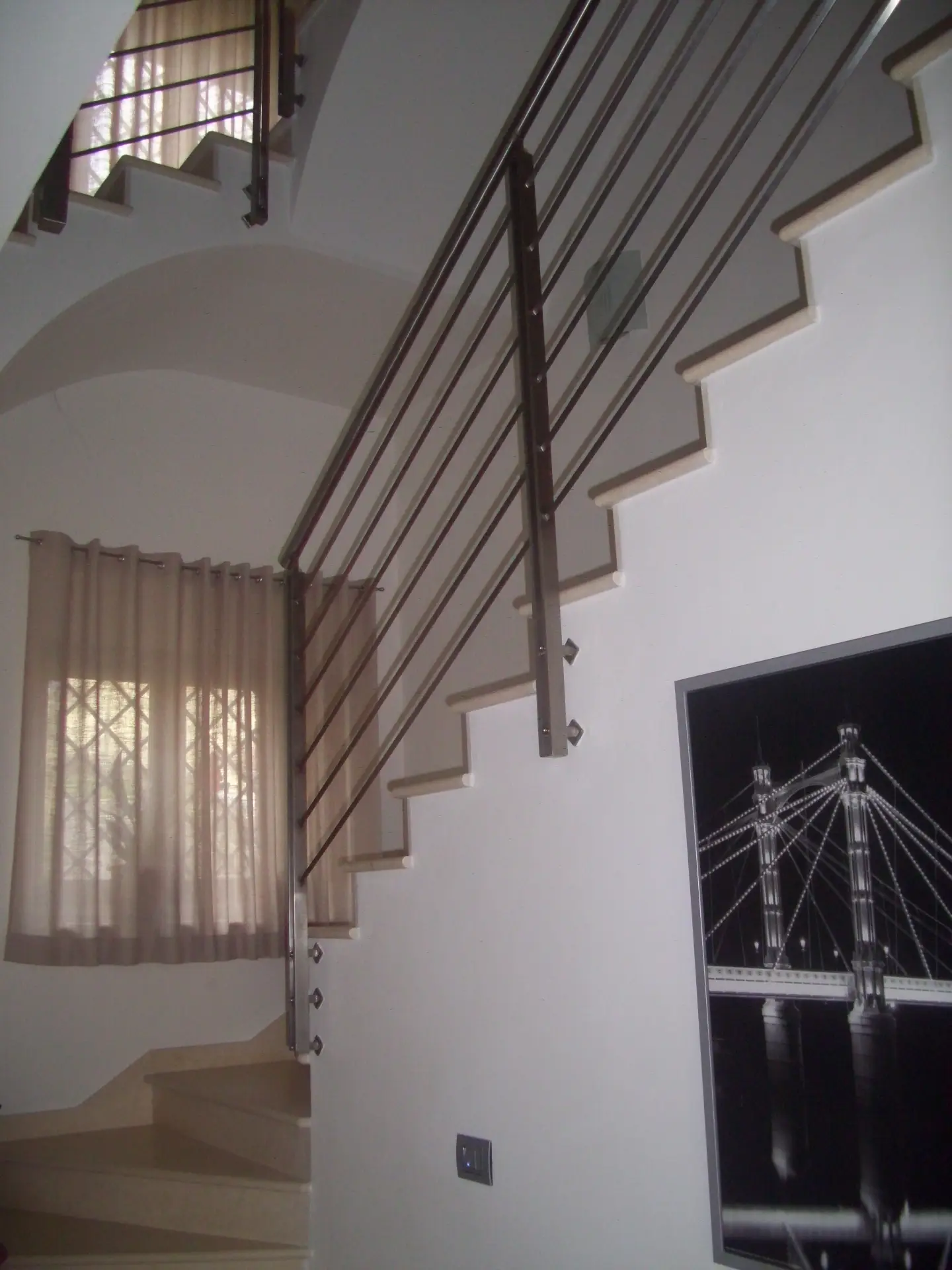 Intervento realizzato per un cliente privato, con installazione di parapetti per scala interna in acciaio inox con pannelli in vetro, caratterizzati da linee curve e sviluppo orizzontale che conferiscono eleganza e continuità agli spazi. L’opera è inserita in un contesto residenziale interno, valorizzando il vano scala con una soluzione luminosa e raffinata, in armonia con l’arredo e le finiture dell’abitazione.
